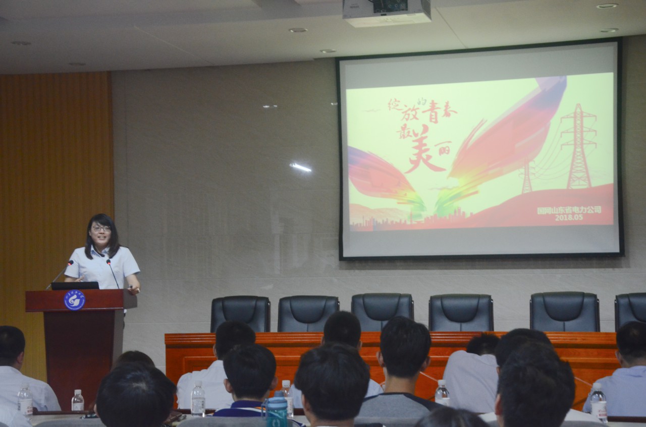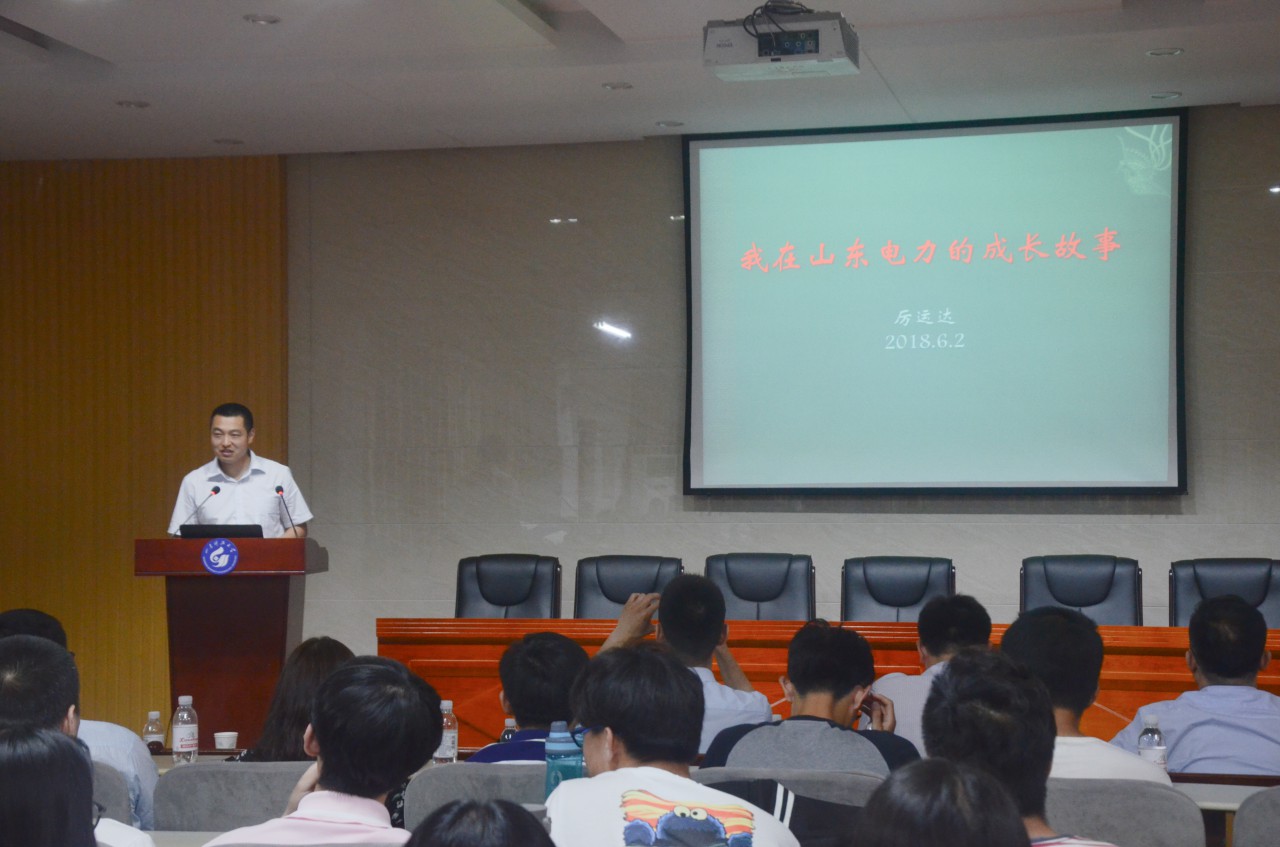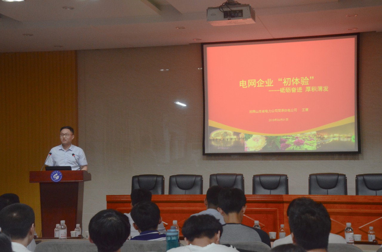 毕建伟讲述了他从一名电气专业毕业生成长为企业名片幕后推手的故事。他还通过PPT、视频向同学们讲解了山东电力文体活动的形式,并为同学们描述了更具体可见的山东电力企业形象。徐可为同学们展示了一组有关“不一样的特高压高空作业”的摄影照片,并为大家播放了“特高压工程建设的全过程”、“大锡盟全线航拍(途径内蒙、河北、北京、天津、河北、山东)”的视频,让同学们感受到了电网建设的艰辛以及电网工作人员永远坚守第一线、不畏艰辛的决心毅力。精彩震撼的视频和照片让在座的学生对电网工作环境、内容有了更加实质性的直观了解,也感受到国网工作人员的艰辛和努力,同时也让同学们对以后的学习、作风有了更好的规划和想法。季素云向大家讲述了自己工作6年来的感受和经历,讲述了自己第一次春节留守工作岗位、第一次在极寒天气连续抢修18个小时等等,让大家领略了巾帼标兵的实力。厉运达与大家分享了他是如何立足岗位转变身份不断成长的故事。他向同学们讲述了有关大客户服务以及电厂管理的一些经历以及应该怎么样学、怎么样干、怎样脚踏实地的做好自身工作。最后,来自山东省国家电网菏泽供电公司的校友王震从电网企业的“初体验”、国网企业的创新两方面做了报告。希望青年学子勤恳学习,摒弃不良习惯,多积累,多磨练,增强自我约束能力,不断提升自身学习能力。在工作中,应该放低、放松心态,谦虚谨慎,不断积累、创新,厚积薄发,会写、会说、会思、会做,承担起相应的个人和社会责任,勇于担当,才能在未来的工作中做出成绩。