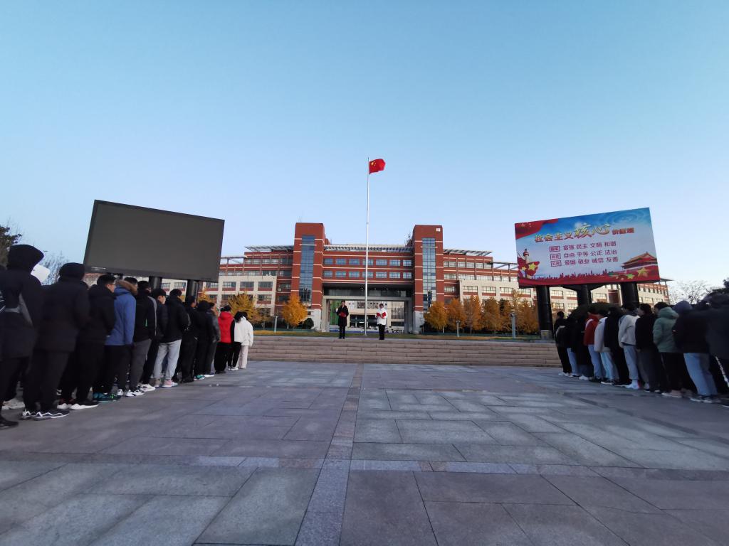 早晨六点整,天色未明,同学们便在升旗台前列队等候。6点30分,升旗仪式正式开始,山东科技大学国旗护卫队队员保持方块队形,昂首挺胸、步伐一致、齐头并进,当国歌奏响,五星红旗向着朝阳冉冉升起,在场所有老师、同学庄严肃立,目光都集聚集于五星红旗之上。
