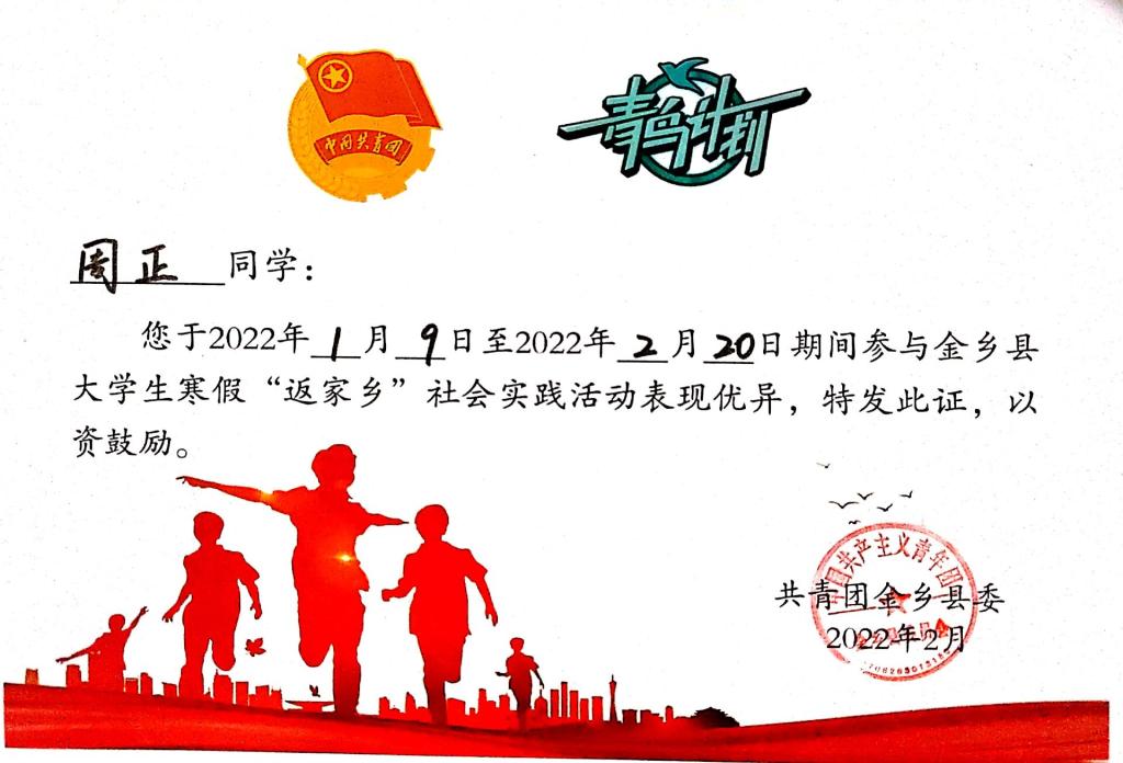 新年过后,周正又第一时间投入实践,为年后颁发志愿者实践证明以及相关证书工作进行积极准备,打响新年新气象,为新的一年营造良好的开端。与此同时,作为“青鸟计划”的一员,他成功入选金乡县“青鸟计划”优秀志愿者,并获得县团委颁发的实践证书。最后他参加了2022年2月15日召开的“青春战‘疫’,感谢有你-霄云镇2022年志愿者总结大会”上,为此次社会实践画上了完美的句号。