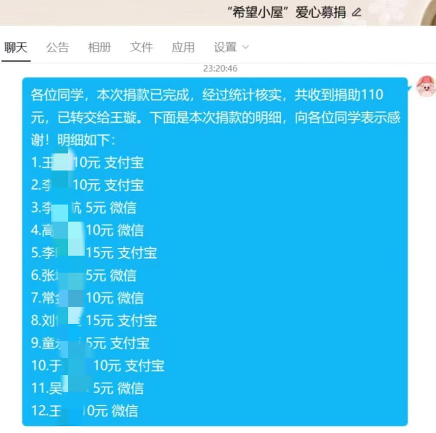 自项目发起以来,我院紧跟步伐,近年来大力建设“希望小屋”,并定期举行募捐活动,以加强“希望小屋”的建设力度。此次捐款活动采取线上方式进行,通过QQ群等发出倡议,进行广泛宣传动员,广大师生积极参与。