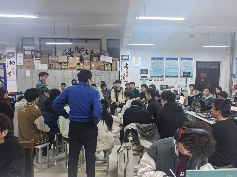 动员会上,工作人员提前 1 小时到场完成物资筹备、现场布置等分工任务,确保活动有序推进。晚上七点,活动正式启动,战队负责人赵翠翠详细解读了联盟赛赛事规则、同组竞争格局及备赛核心重点,明确了 “强化技术打磨、提升协同效率、培养实战人才” 的备赛目标。随后,通过任务拆解与责任划分,将机器人轻量化研发、3 机协同系统优化等核心工作落实到具体成员,明确各阶段时间节点。大会最后,全体成员围绕备赛难点展开交流讨论,梳理出技术优化方向与应急处理流程,为后续训练明确了路径。