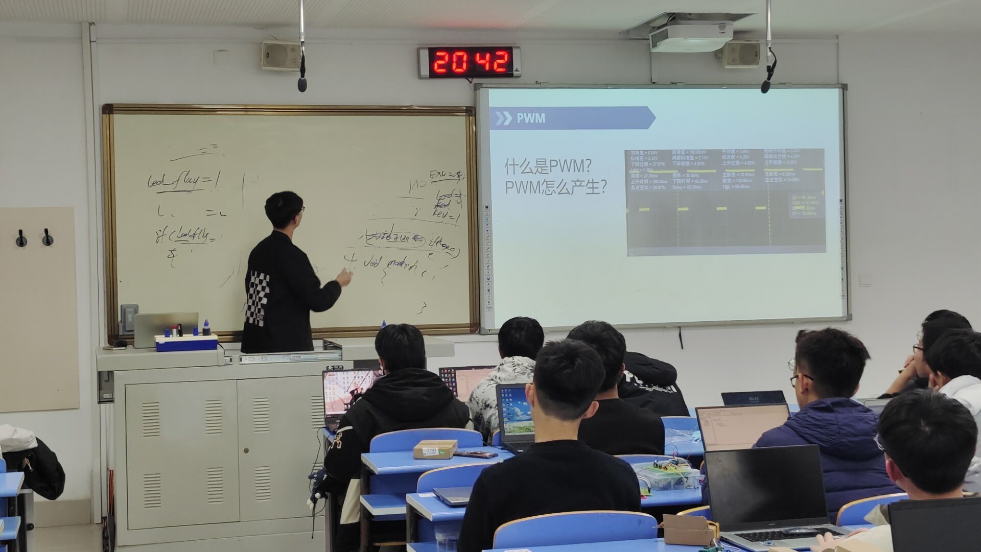 2023年12月16日,J7-212,为了拓展单片机开发基础,介绍单片机的相关应用,现面向自动控制协会全体成员,举办此次讲座,以讲练结合的形式。向社团成员介绍单片机的中断系统有关知识,并对所学知识进行练习。活动过程中会出现有些学生不理解讲课内容的问题,但各个组长都及时做出调整,使绝大多数同学都跟上来了。各个组长及会长也是很认真负责,非常照顾绝大多数的学生。各位组长以及会长起到了良好的积极作用,积极上台鼓励同学努力学习,积极帮助同学解决问题。